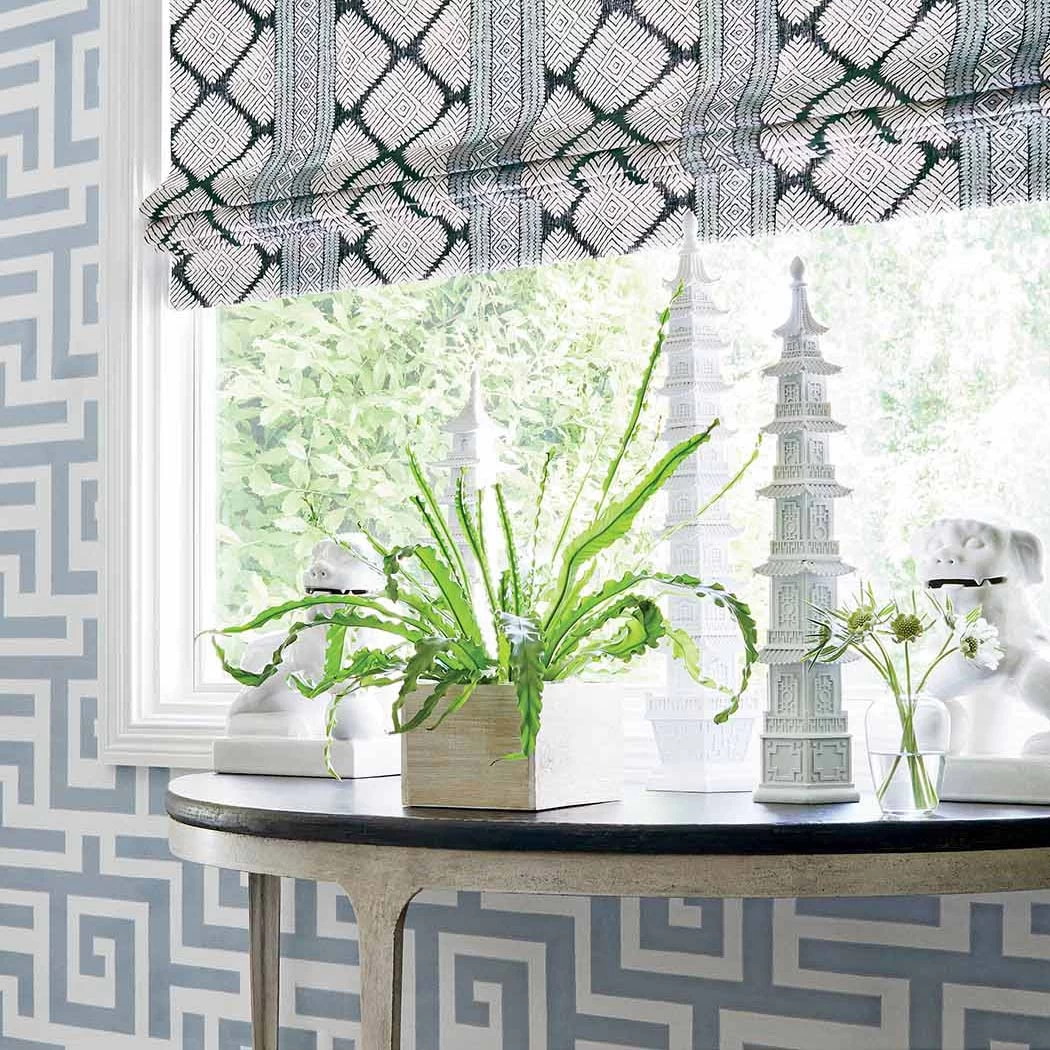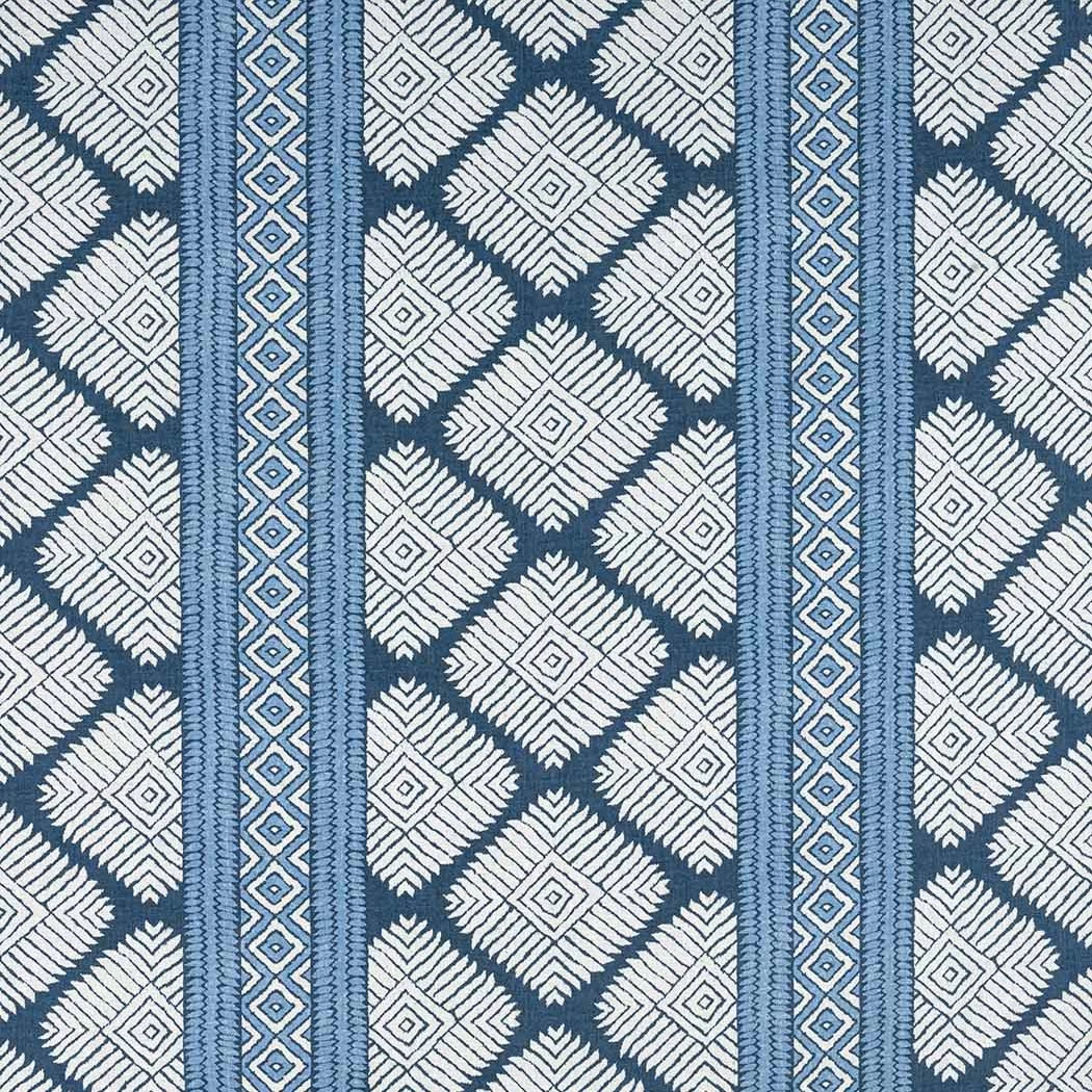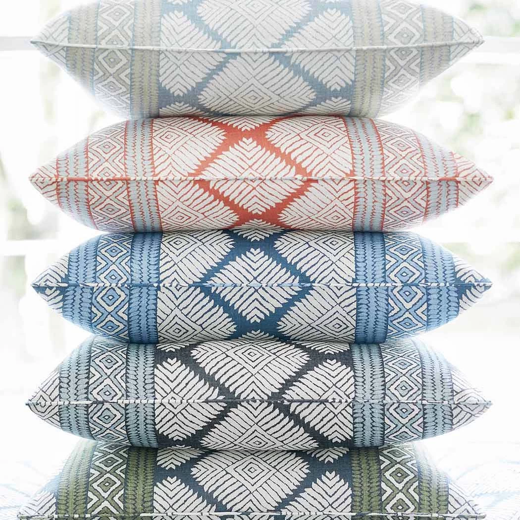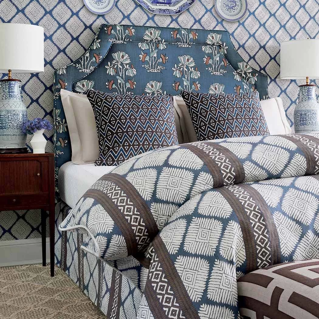 Austin fabric unites small and large-scale patterns in perfect harmony. The leaf shaped diamond is positioned between embroidered borders, adding another layer of dimension and color.