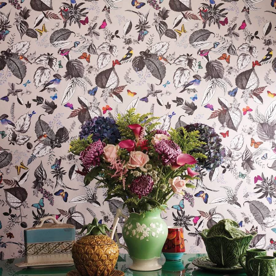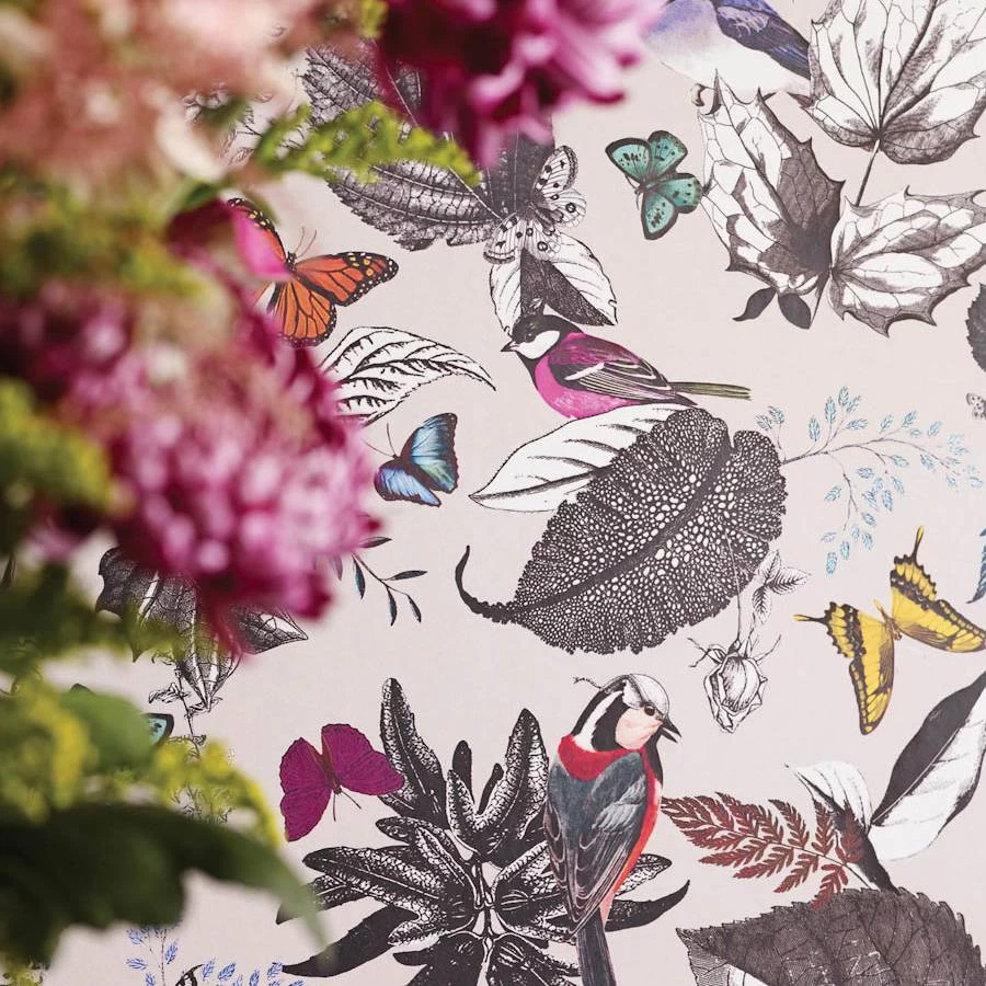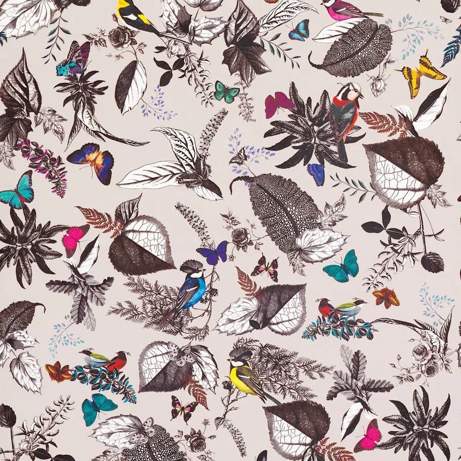 An exotic composition of birds and foliage. Digitally printed with a repeat of 150cm (59ins).