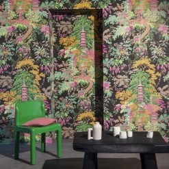Taken from the archive, this dramatic Chinoiserie design of swirling dragons, formalised clouds and branches laden with blooms is based on an 18th century Chinese imperial dragon robe. Rich in symbolic meaning denoting power, strength and good luck, the number of dragon motifs traditionally revealed the wearer’s rank and status. ‘Chifu’ has now been interpreted as a spectacular wallpaper