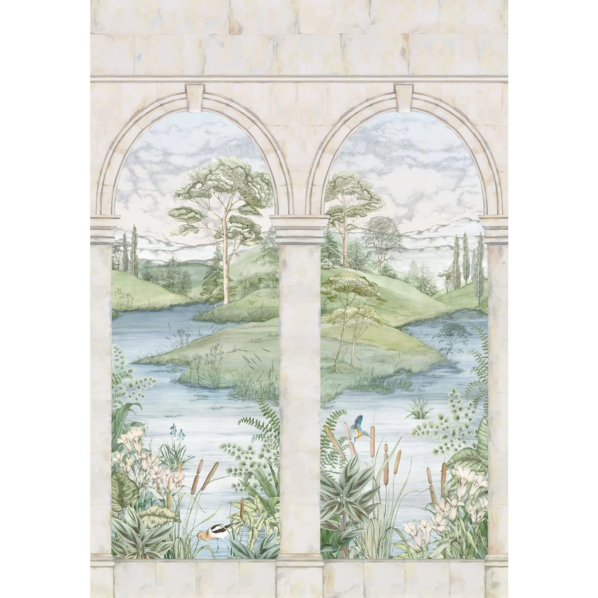 A picturesque lake with bulrushes, water birds and rolling hills beyond is viewed through the archways of a stone colonnade.