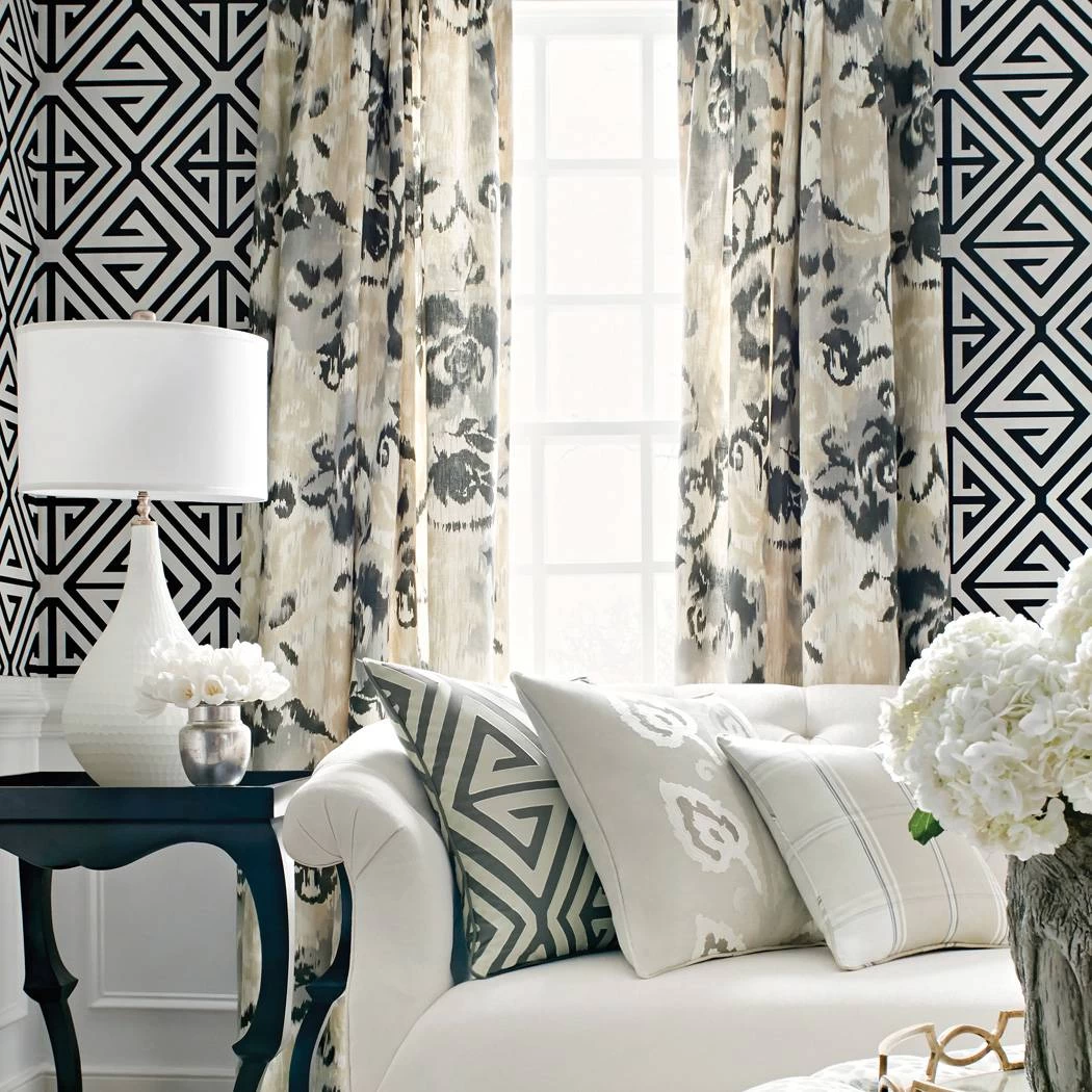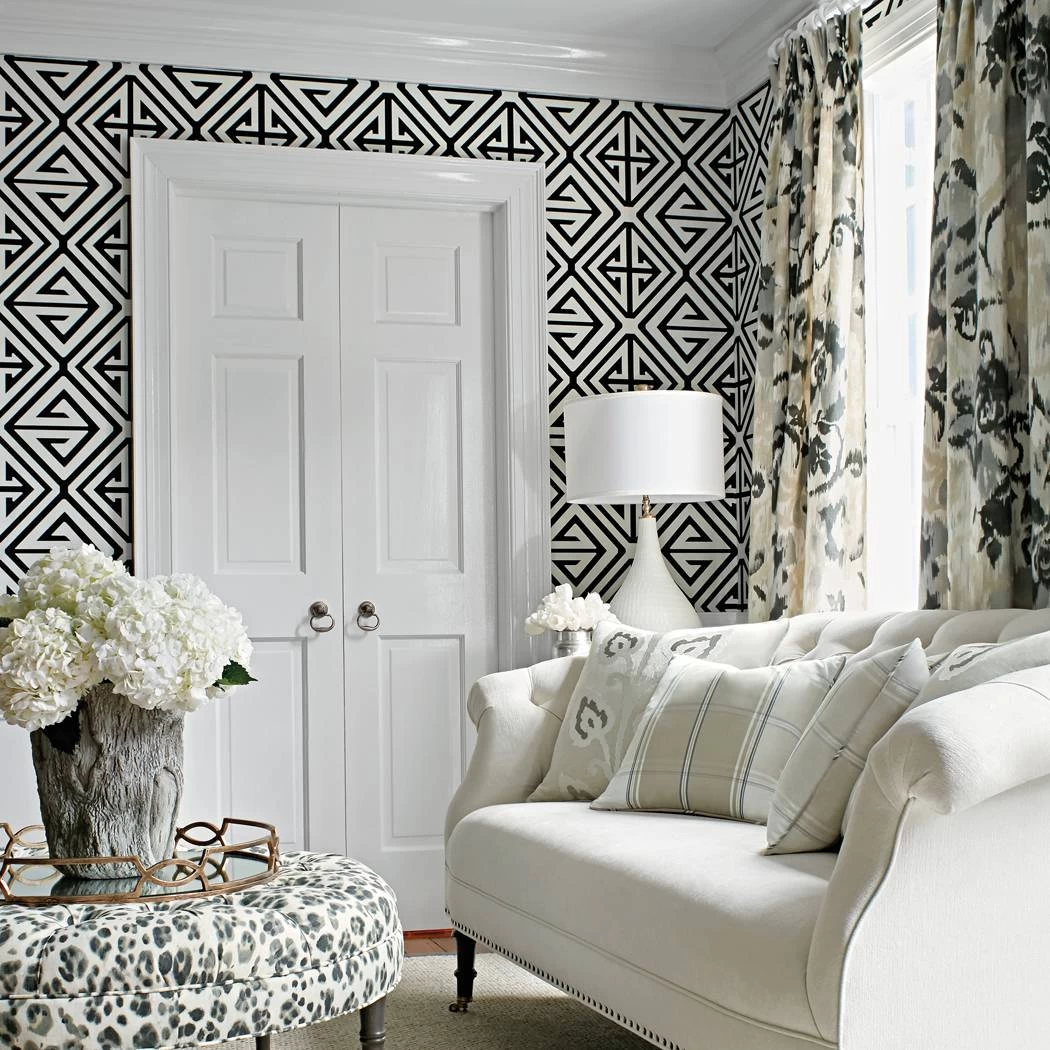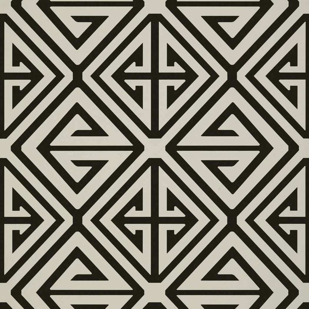聽Demetrius聽is a large-scale graphic pattern inspired by the coordinating appliqu茅 fabric. The white fabric is appliqu茅d onto the darker ground. The pattern references a Greek-influenced geometric. The wallpaper is perfect for the ceiling or for use on an accent wall. This is definitely a statement-making wallpaper!