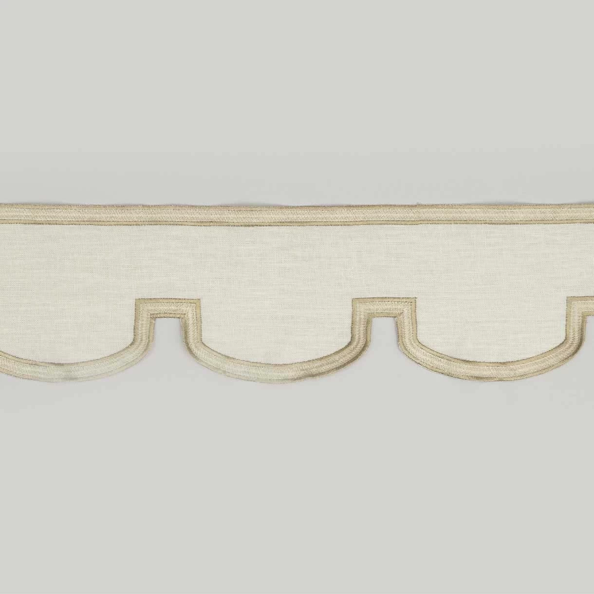 Tony Duquette used a classic valance all around the drawing room of ‘The Porcelain Pavilion’, his house in Paris. This pattern occurs many times over in Duquette’s work, whether rendered in paint or as fabric dipped in plaster. Our updated version features the same scalloped-edge valance design, composed of linen with embroidered edges and scaled down just a bit for use as trimming for draperies, chair and sofa skirts, or even the edges of book cases.