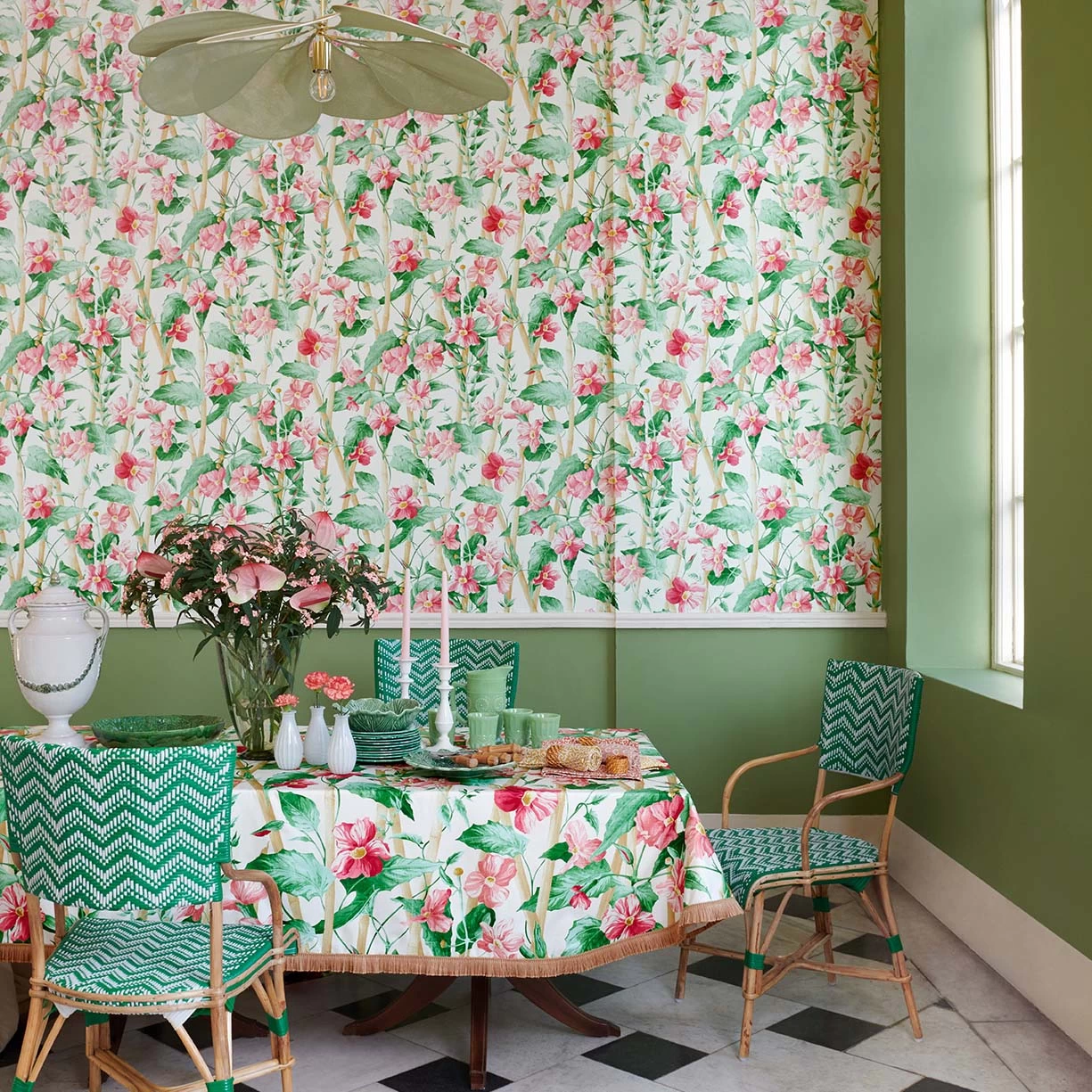 A beautiful trellis design featuring delicate ipomea flowers gently interlacing with bamboo to offer the spirit of an active conservatory. The design includes a subtle texture effect adding depth to this luxury wallcovering.