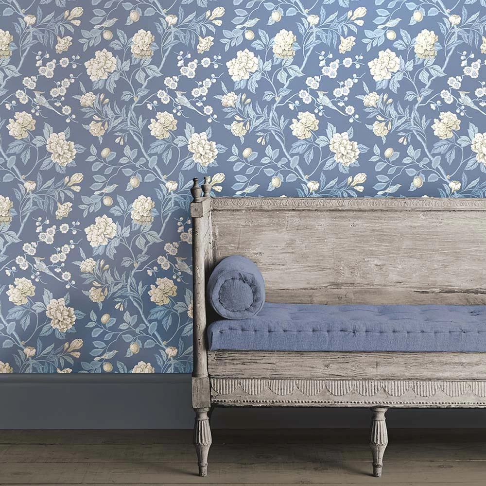 This design is derived from a group of hand-painted Chinese wallpapers discovered in a manor house in Kent. The lavish floral of peonies in full bloom with cherry blossom entwining fruit and birds of paradise has been skilfully translated into this exquisite new version.