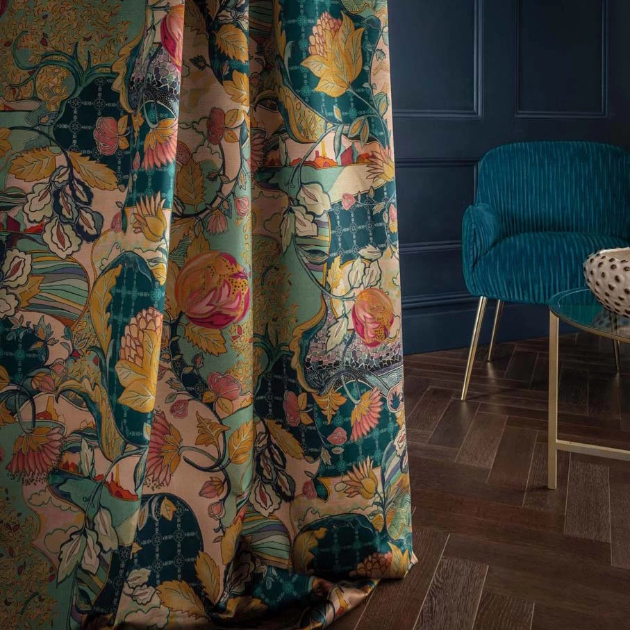 The pastoral beauty of the English countryside is re-created in a collage of rolling hills with stylised trees and country stonewalls. The view is seen through the stems and flowers of a rambling rose. Digitally printed on cotton viscose velvet.