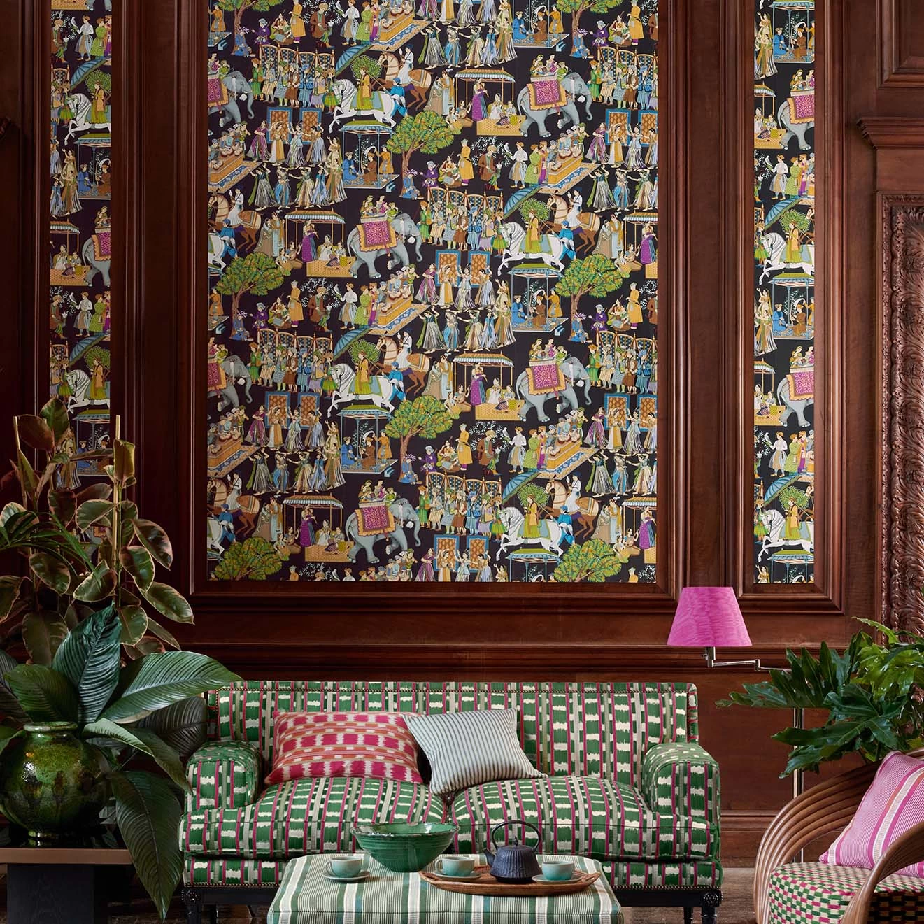 This classic print of Indian dancers and musicians in traditional outfits and vibrant colours, sometimes mounted on horseback or elephants continues the Manuel Canovas range of bold pictorial signature designs.