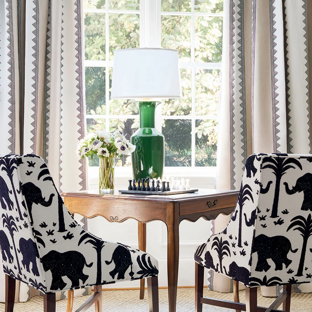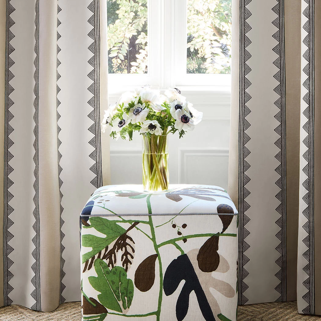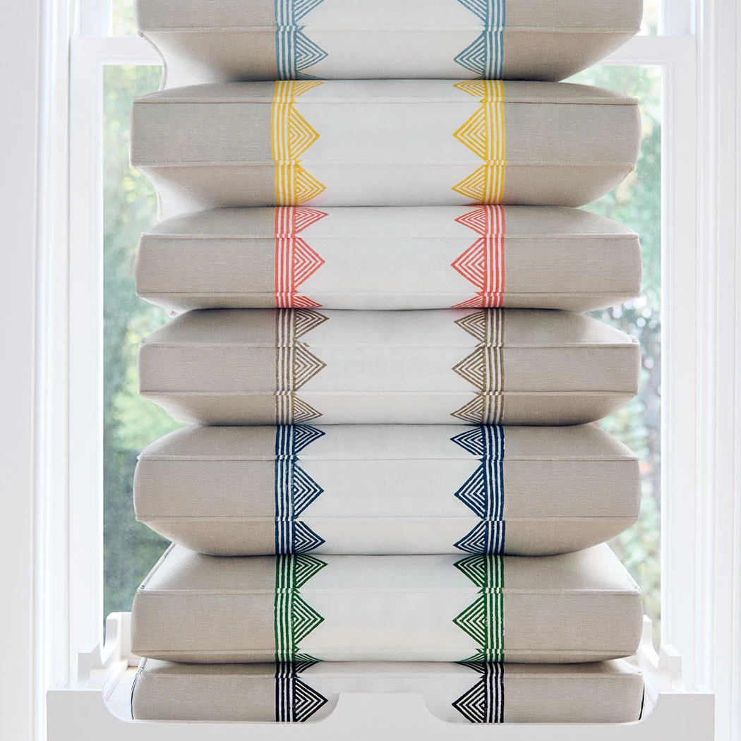 Kismet Stripe is meticulously crafted with detail and precision. The stripe is woven on a linen cotton blend with repeating triangles block printed along the edge of the stripe.