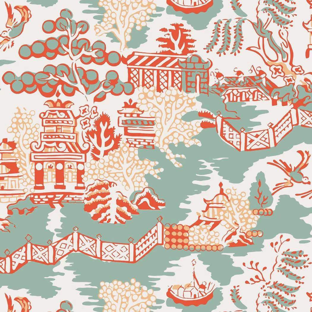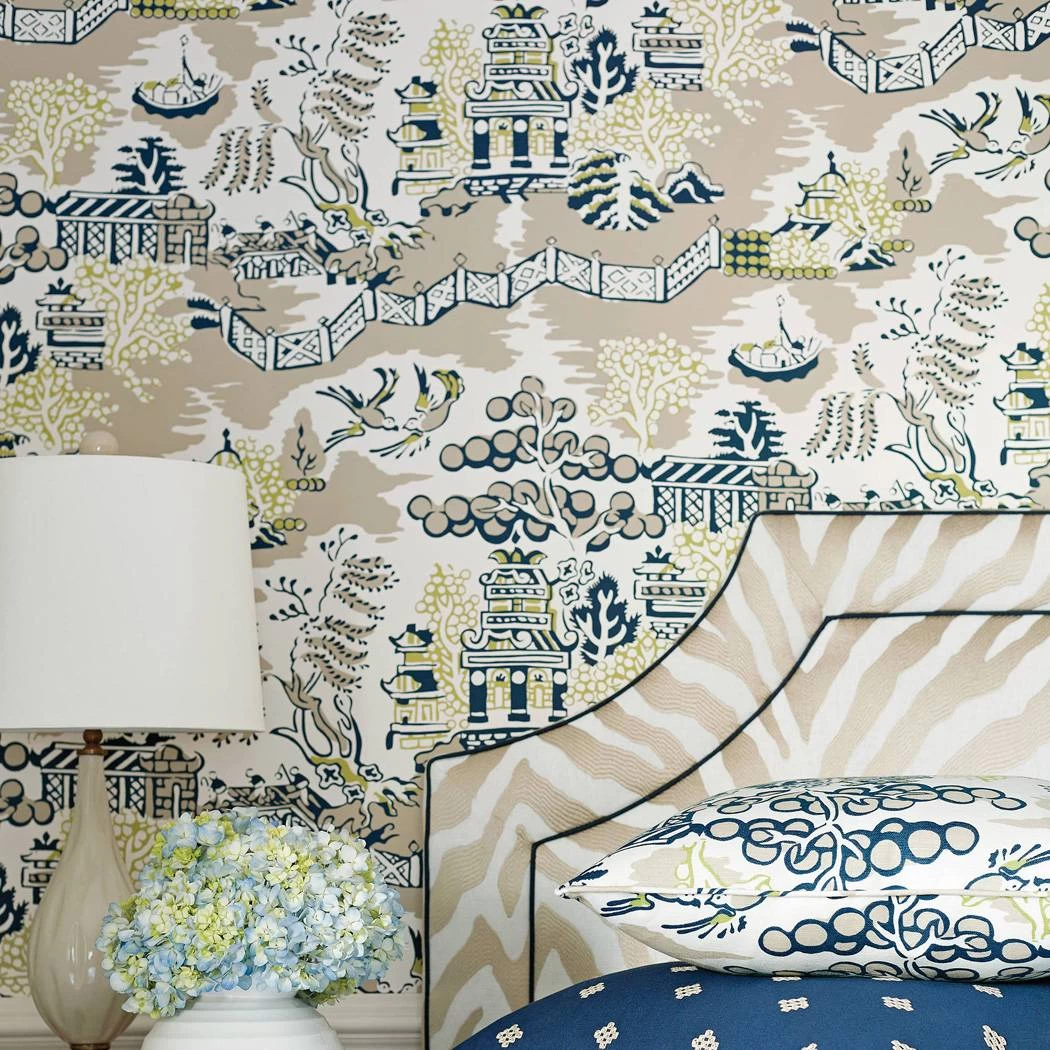 Fall in love with聽Luzon, a large-scale chinoiserie pattern that elegantly travels on the wall. This pattern is graphic and clean with finite details like fretwork fences and unusual trees. Crisp and upbeat colorways include aqua and coral, grey and lemon, green and raspberry, blue, grey and black, navy and beige. All colorways have a coordinating fabric in the same scale, while the pearl colorway is available as wallpaper-only.