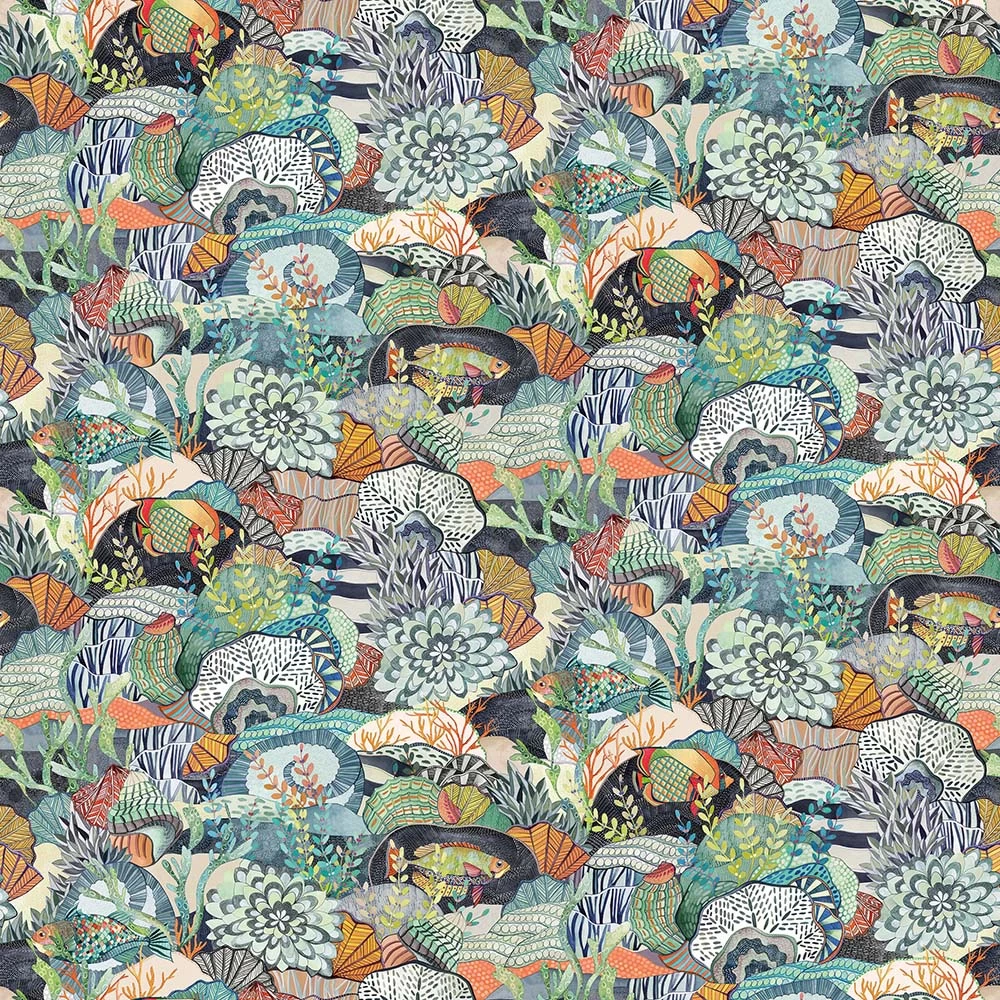 A richly patterned underwater composition of tropical fish, shells and sea anemones.