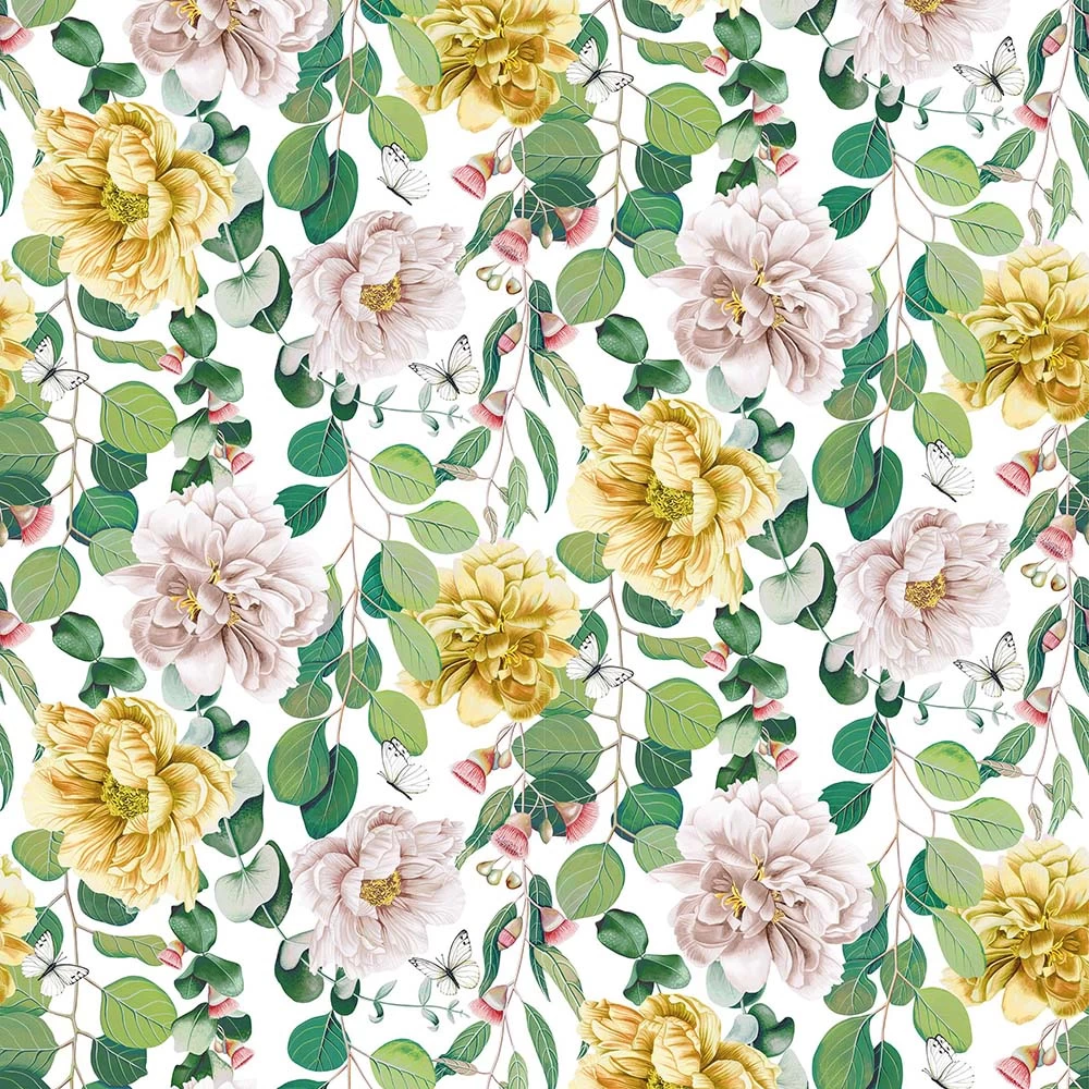 Flowering eucalyptus, peony blooms and small white butterflies are interpreted as a fabric; originally designed for wallpaper.