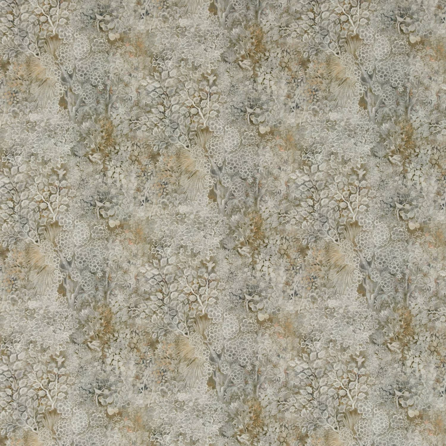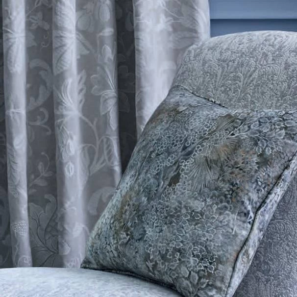 This idealistic view of an idyllic garden was inspired by an illuminated book of magnificent Indian paintings. The eye is drawn to the pale doves in flight between exotic trees and flowers and is printed on to a glowing velvet as well as a beautiful woven ground.
