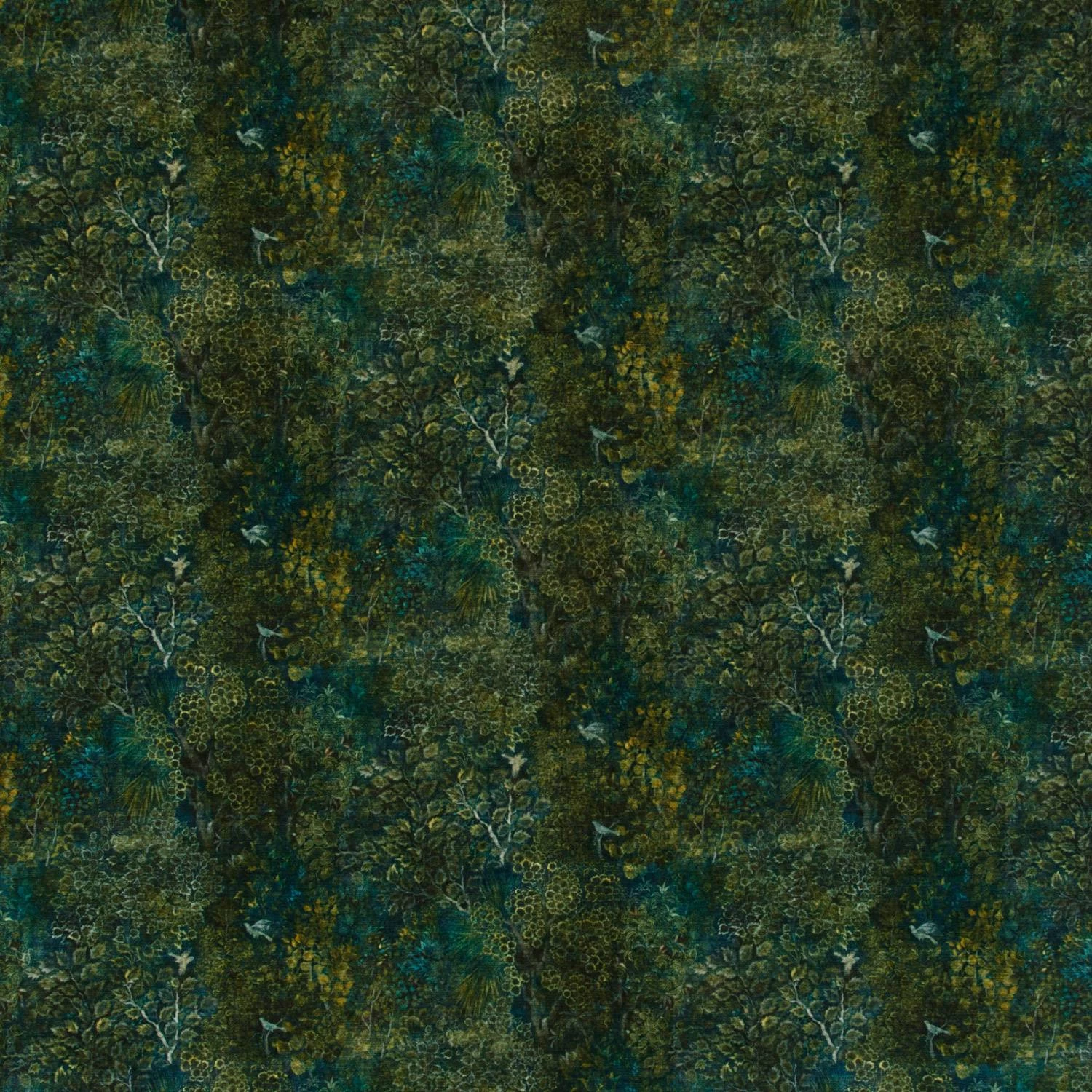 This idealistic view of an idyllic garden was inspired by an illuminated book of magnificent Indian paintings. The eye is drawn to the pale doves in flight between exotic trees and flowers and is printed on to a glowing velvet as well as a beautiful woven ground.
