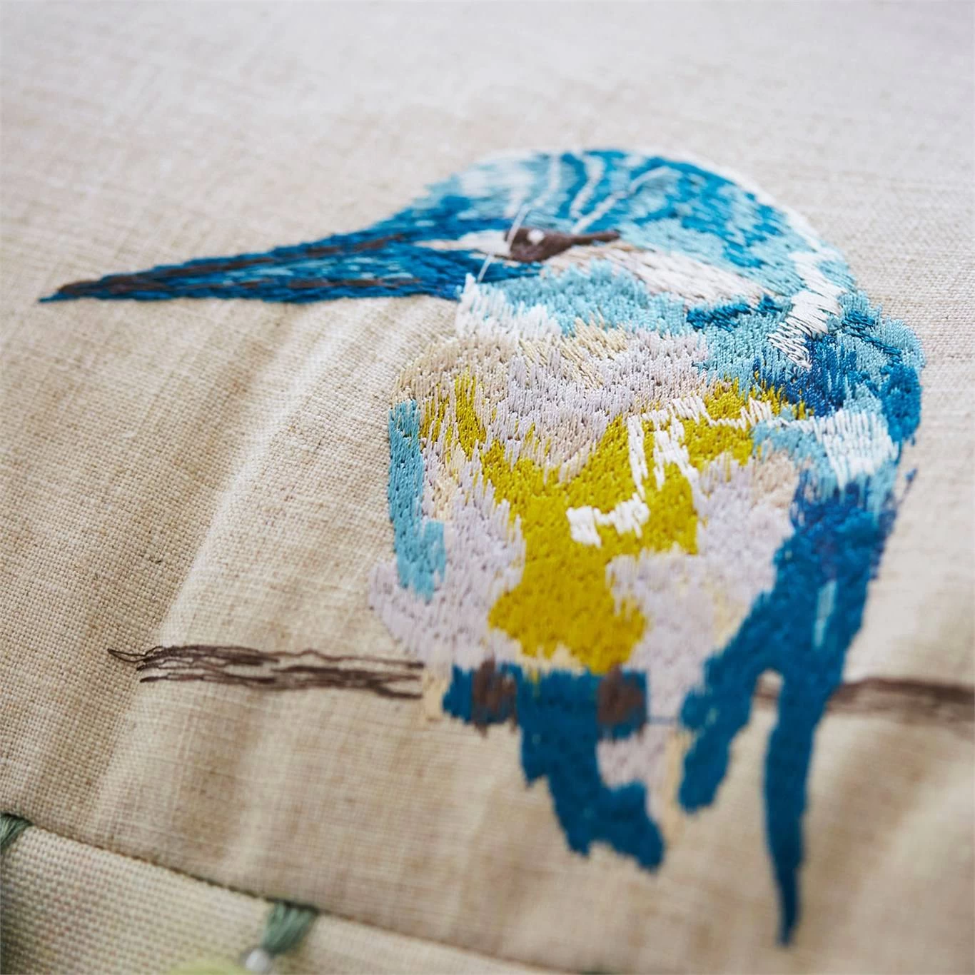 A glorious representation of British birds perched on branches, embroidered onto a natural ground.