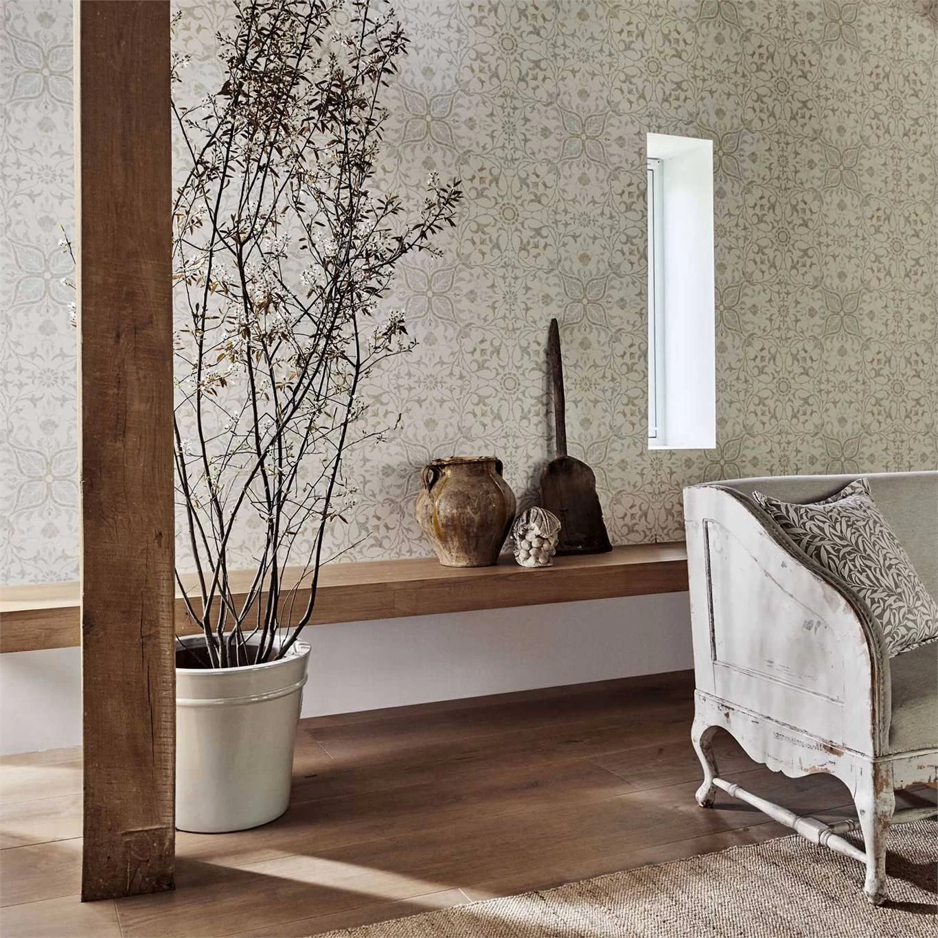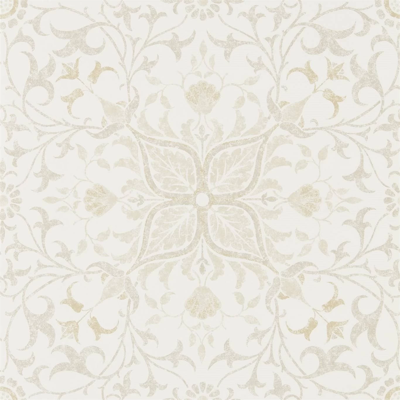 The original wallpaper (1895) is one of only five ceiling papers created by Morris & Co. Depicting cornice work, this pattern has been machine printed for the first time.