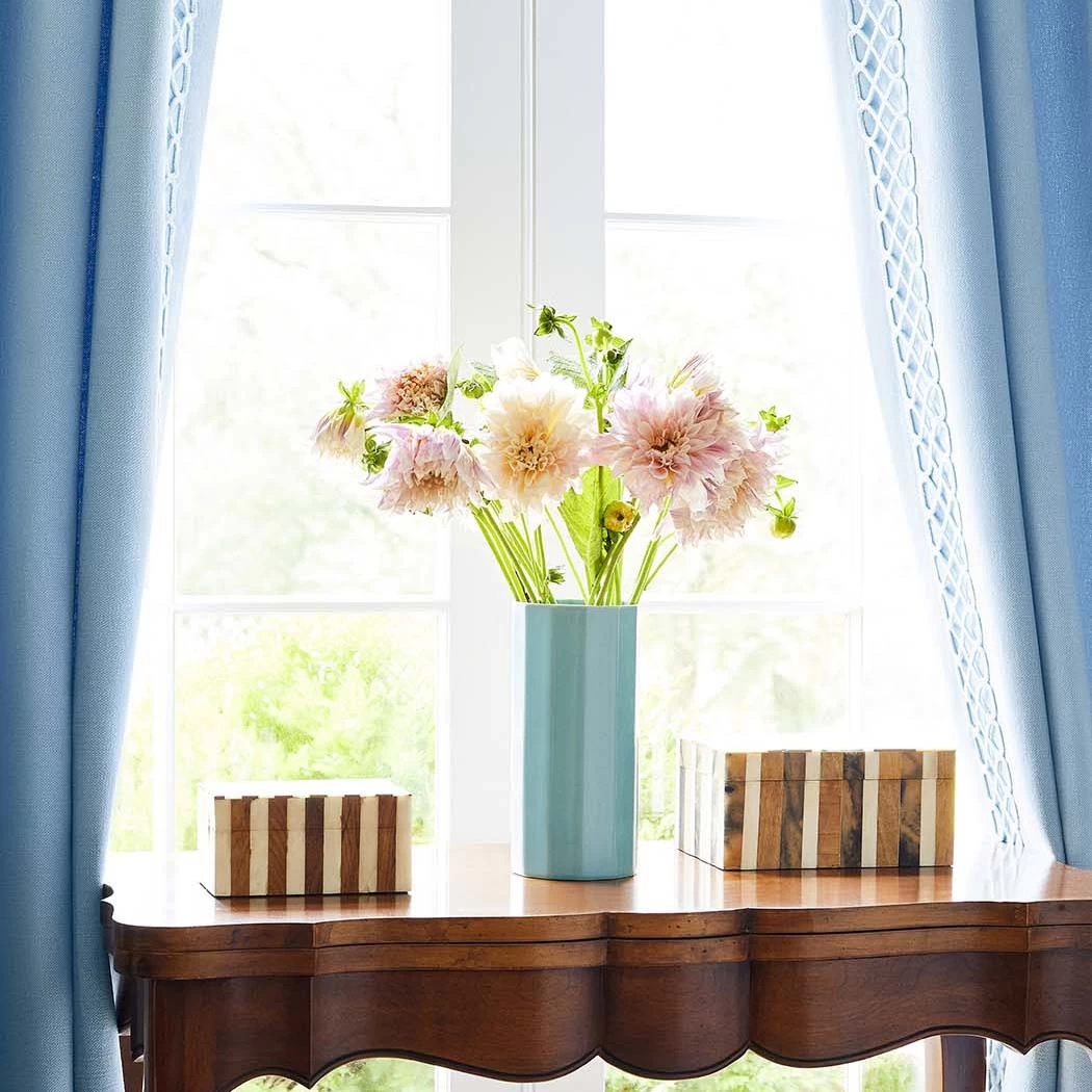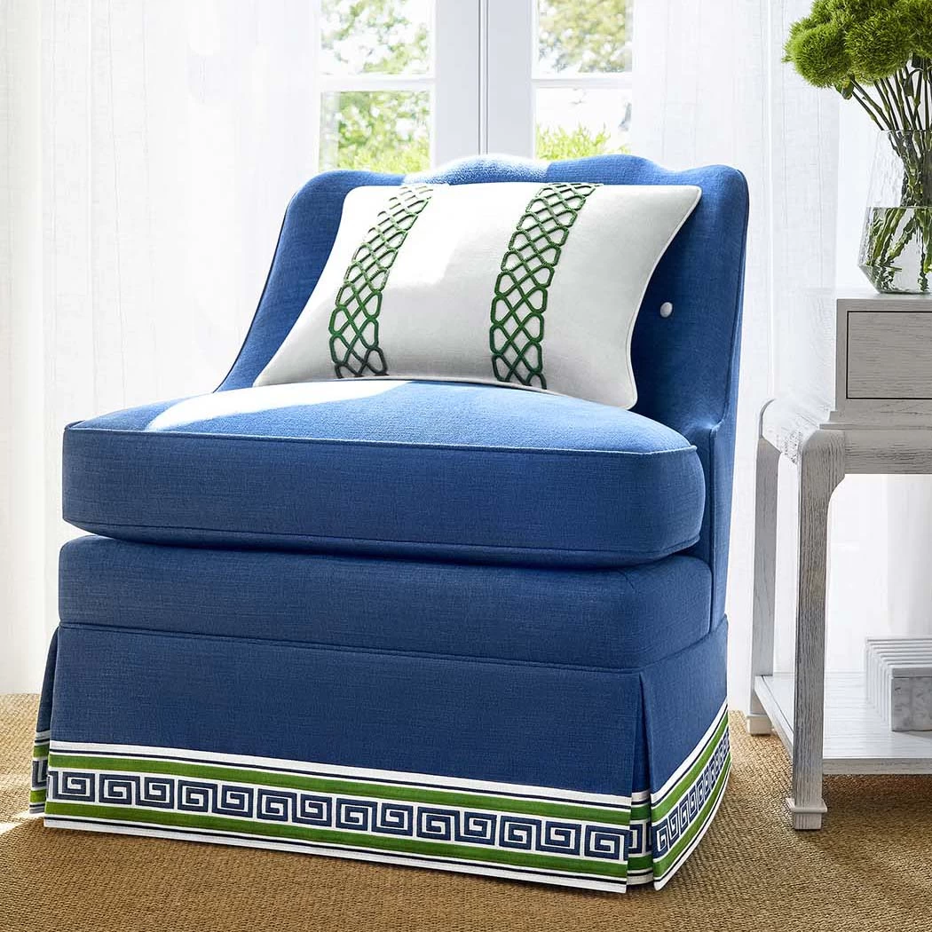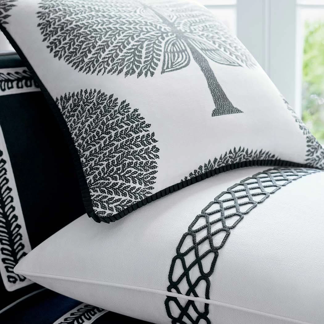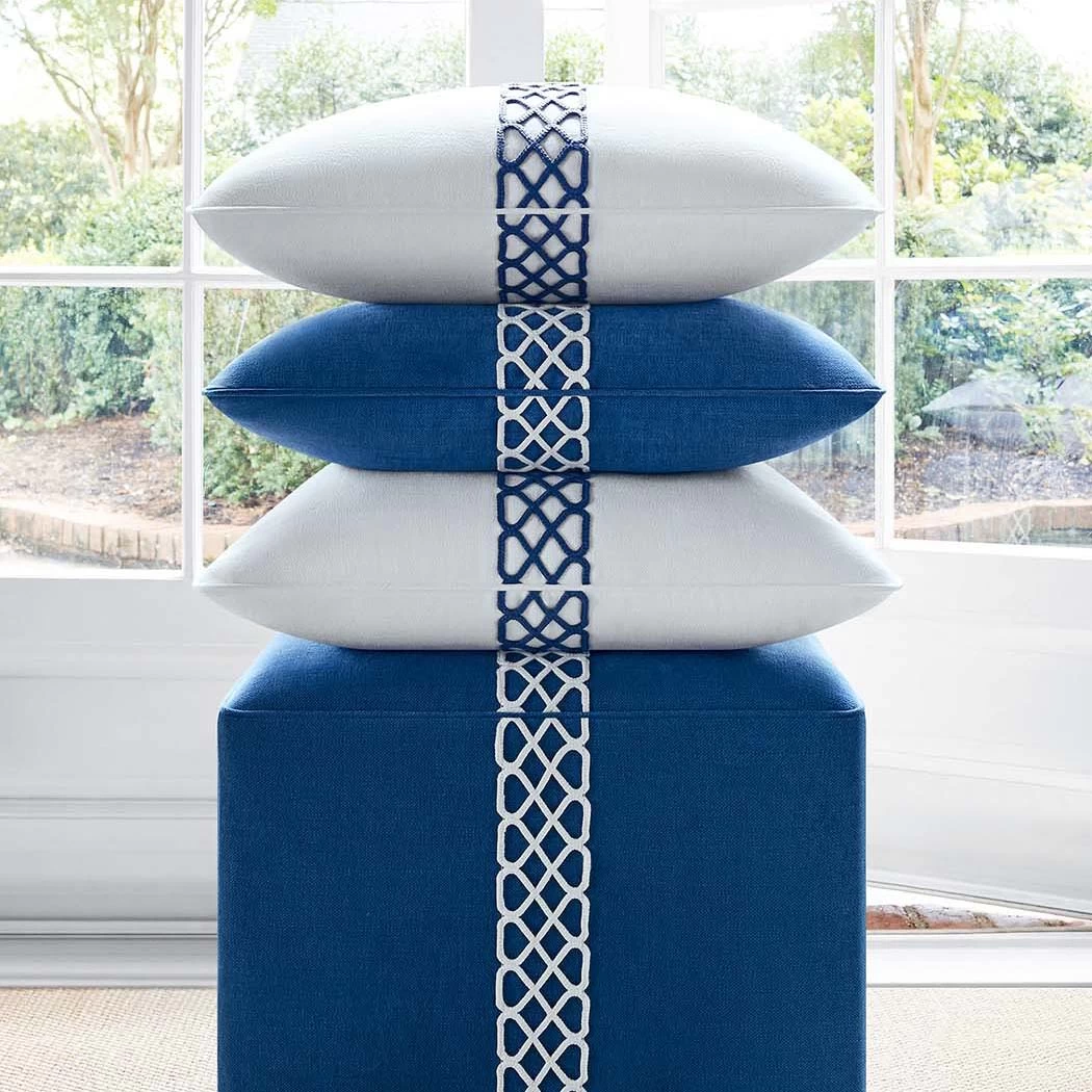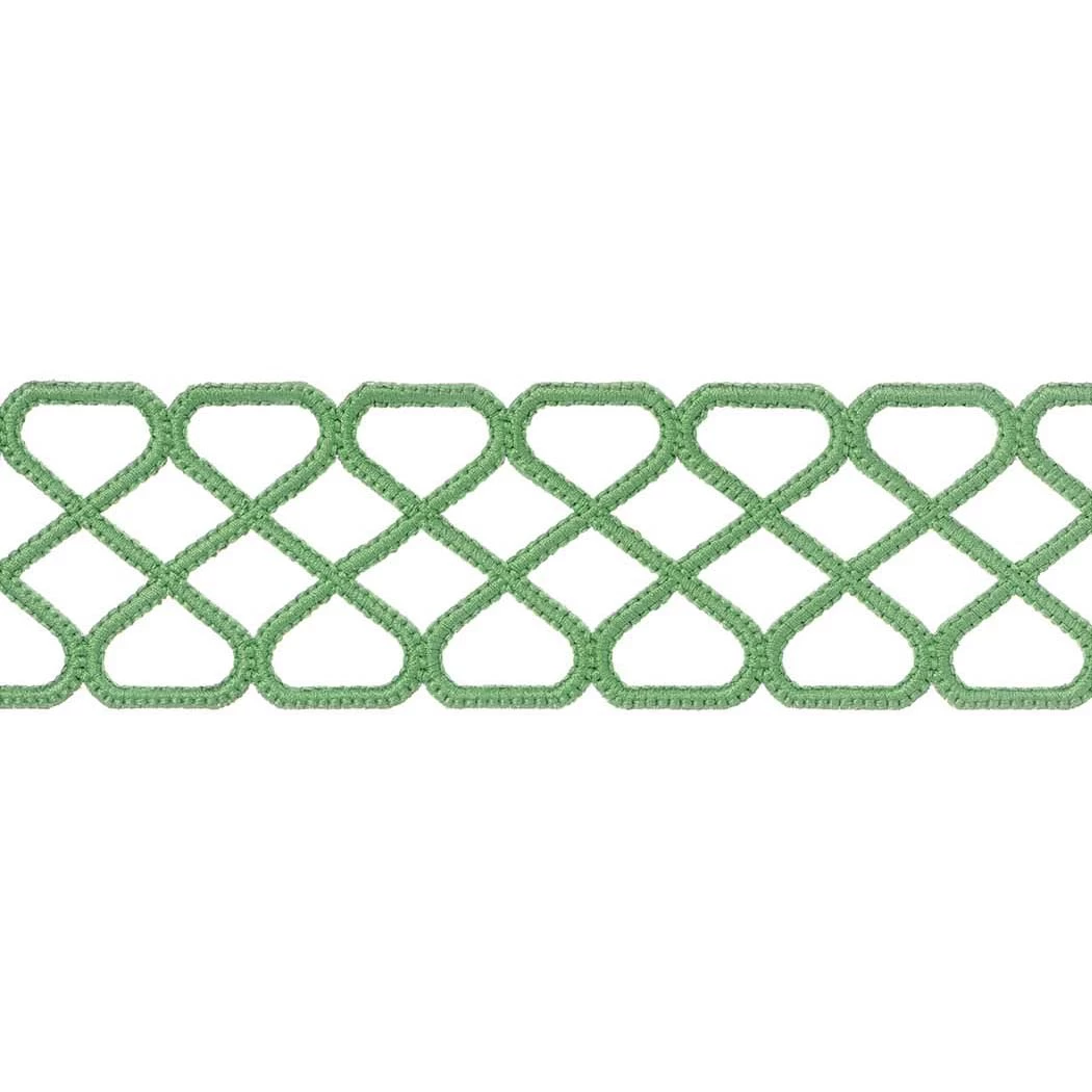 Ripley Appliqu茅 is an open, lacelike trim made by embroidering over a cord that is sewn into our design. A ground fabric showing through the trim adds dimension and texture.