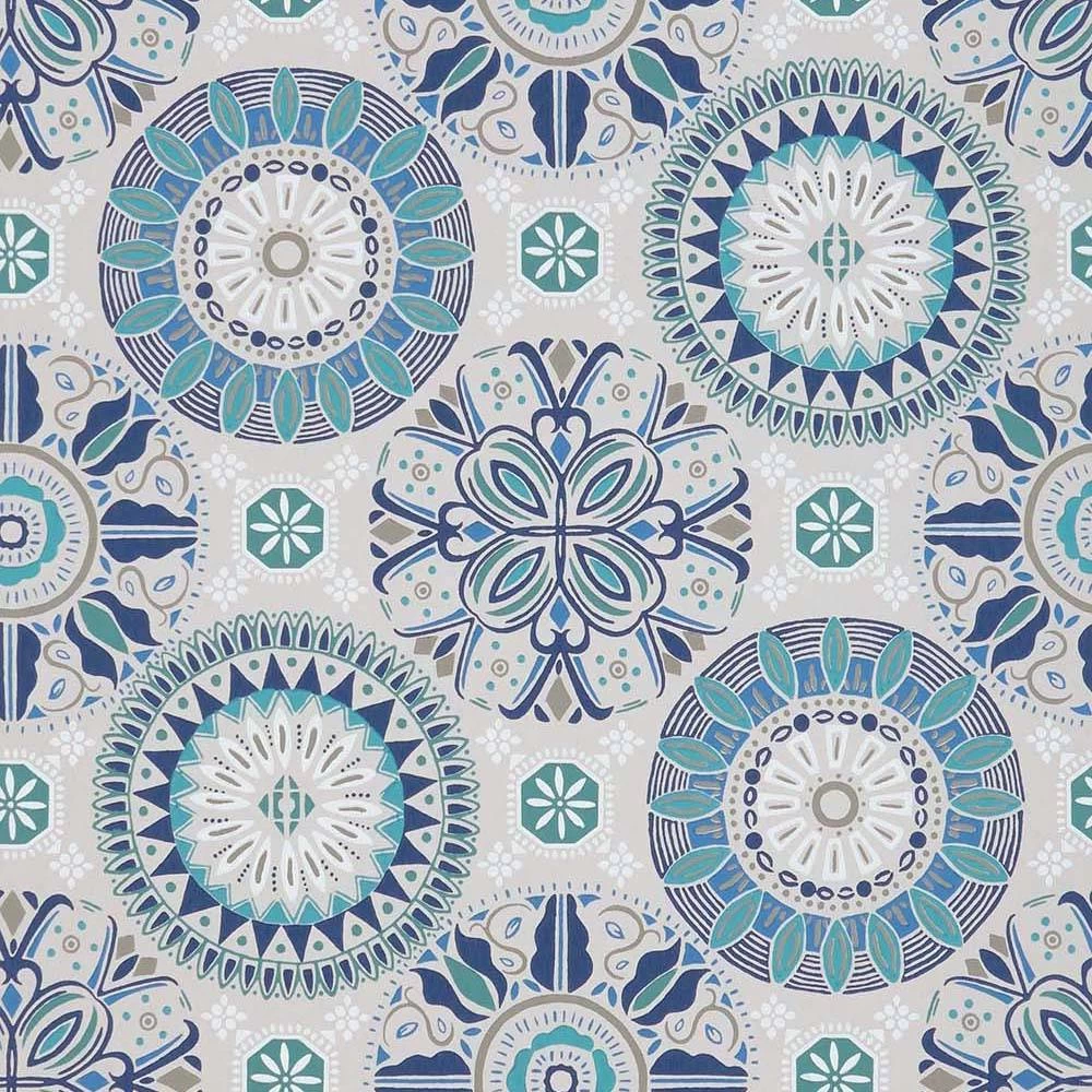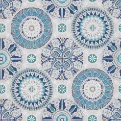 A composition of stylised roundels with a Byzantine touch, in colour combinations of charcoal and mint, grey and white or grey and blue.