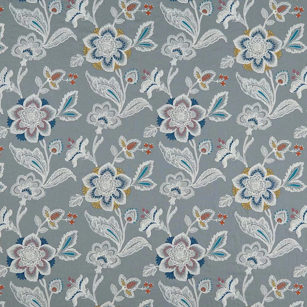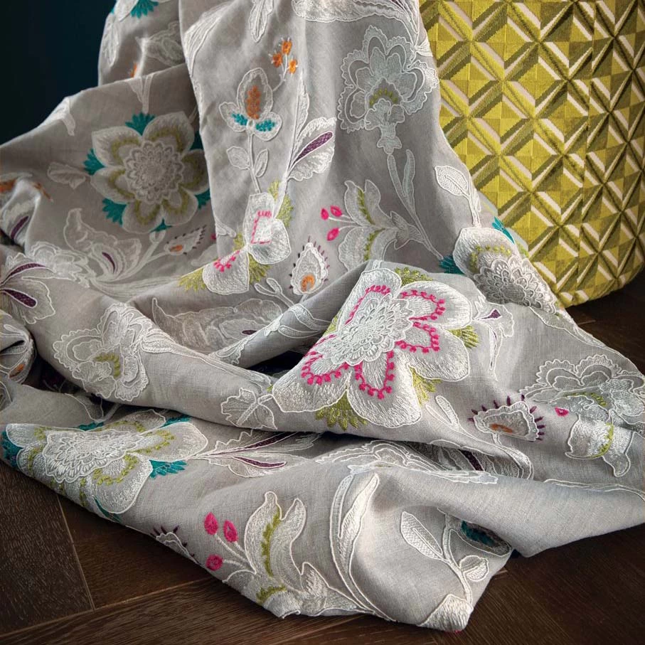 Roses and lilies are embroidered with freestyle stitches within a cord outline on a linen ground. The intricate lace-like floral design is enlivened with accents of jewel colours.