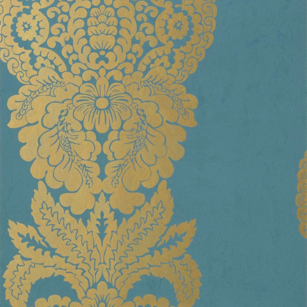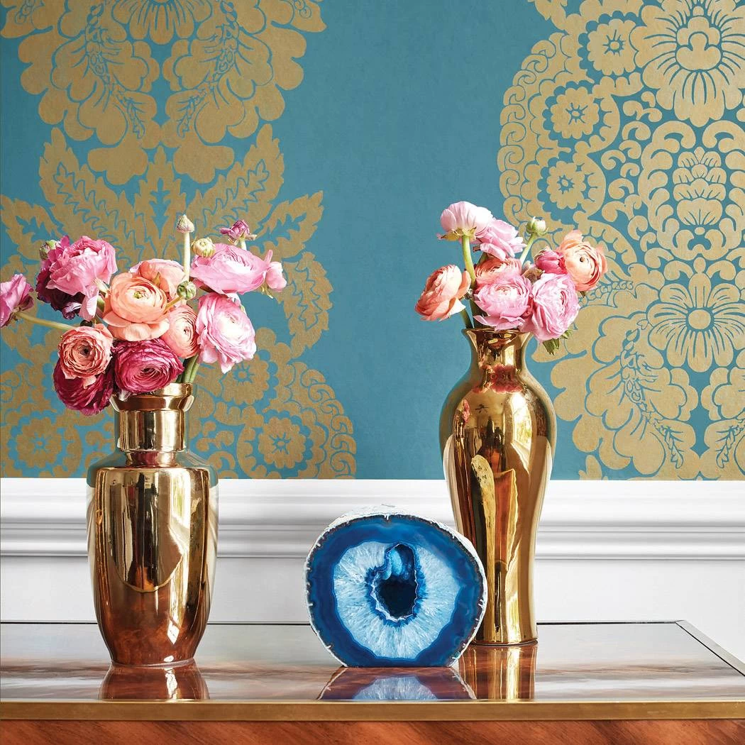 Rowan Damask聽is a striped damask that is flexo-printed with added texture for depth and interest. There is a contrasting texture on the background, creating a marbelized look. This pattern is offered in striking grounds with metallic damask colors, as well as a flocked version in two glamorous colorways that have an aged mirror effect with a slight texture in the ground. This pattern is perfect for flock printing because it has separate shapes constituting the damask.