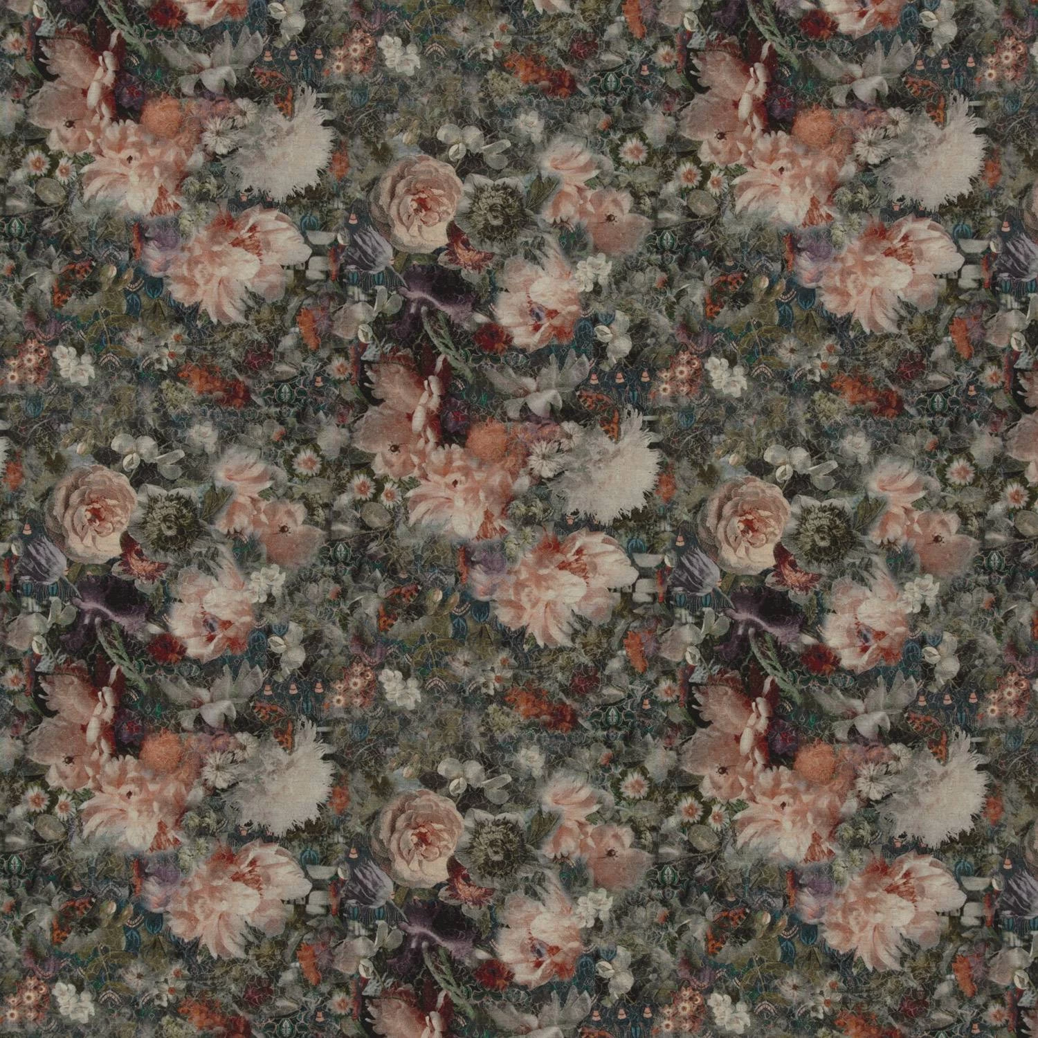The design of this beautiful print on velvet and linen takes inspiration from the gardens of Hampton Court, Kensington Palace and Kew Palace and is reminiscent of the romantic blooms painted on to the ceiling of the ‘King’s Little Bedchamber’ by the Italian artist, Antonio Verrio at Hampton Court.
