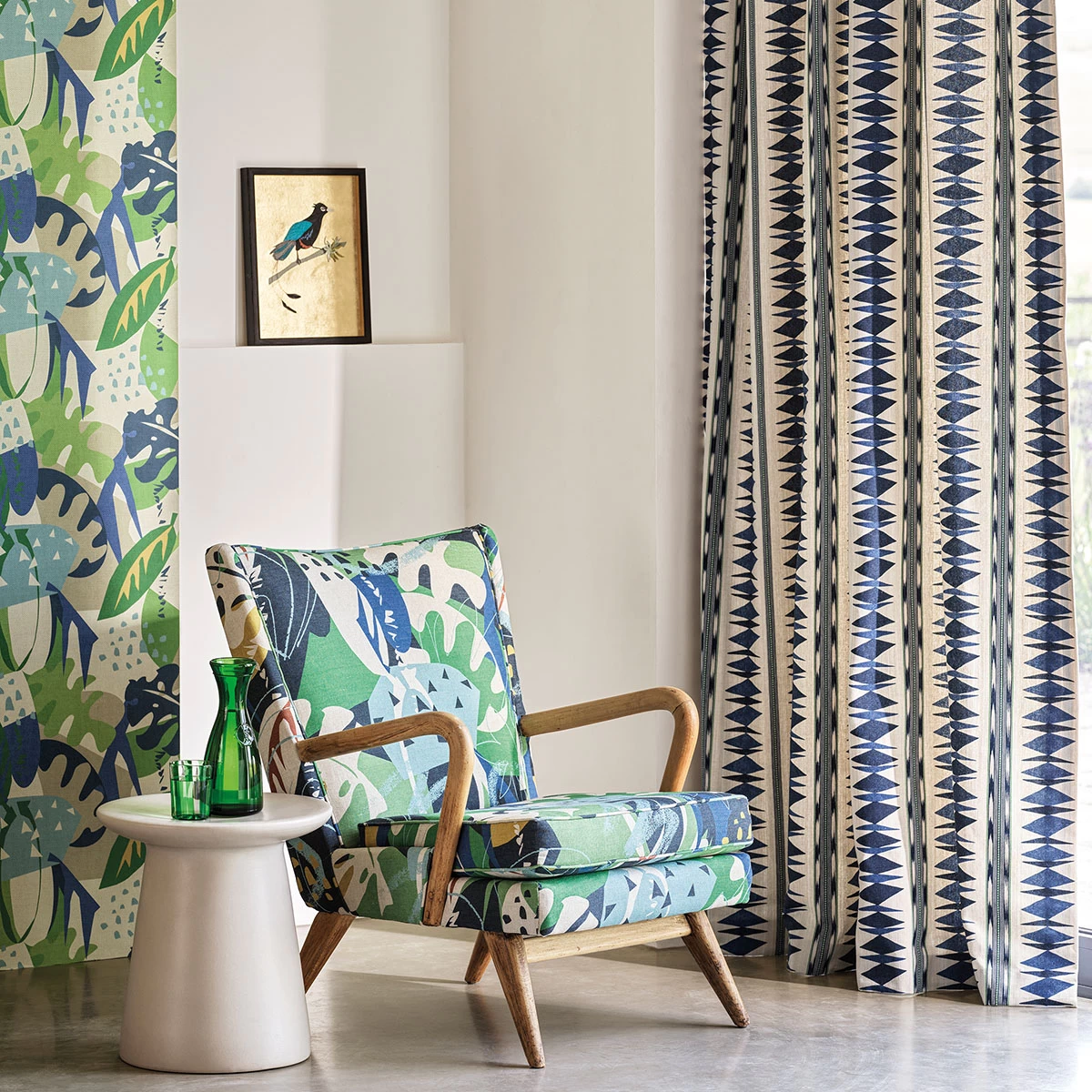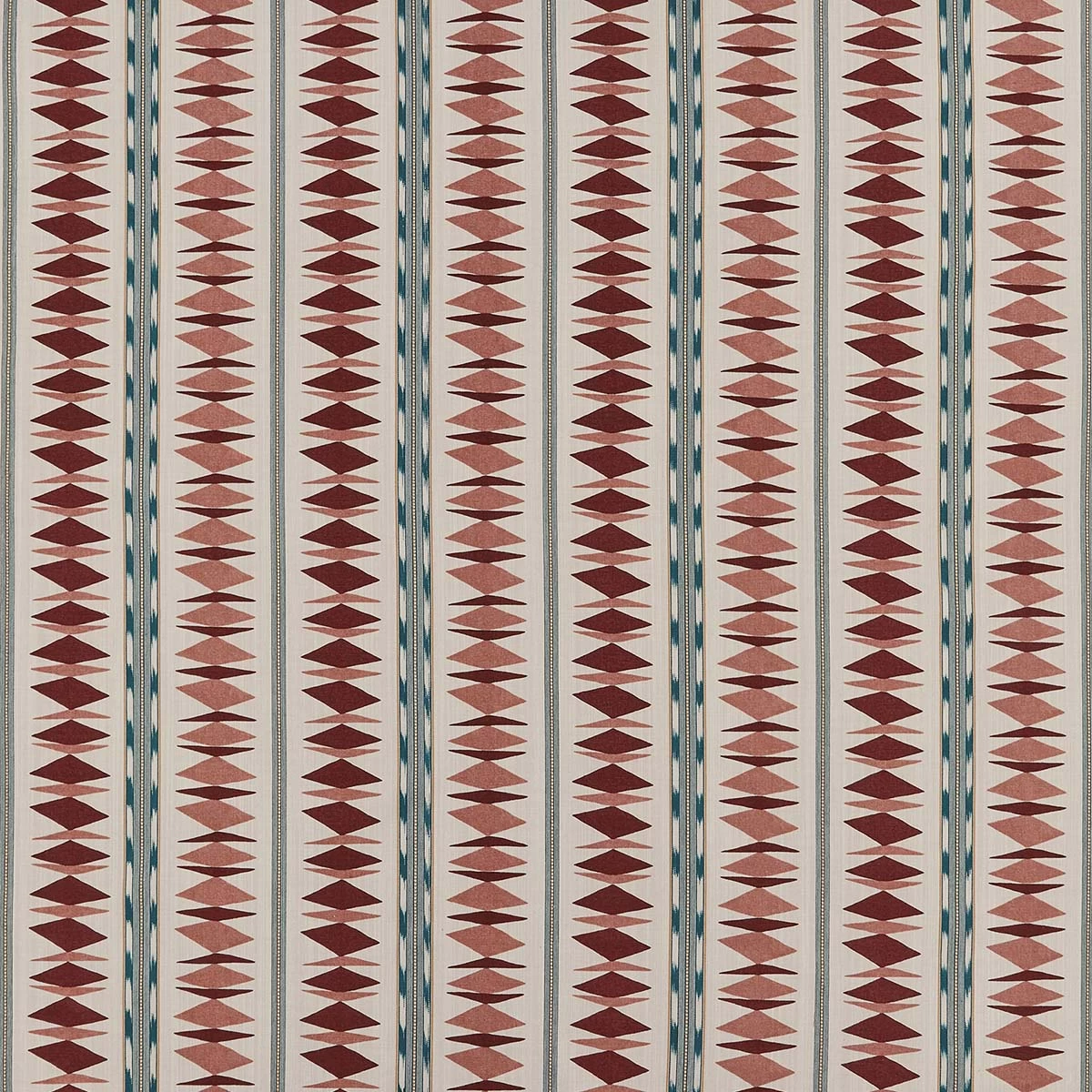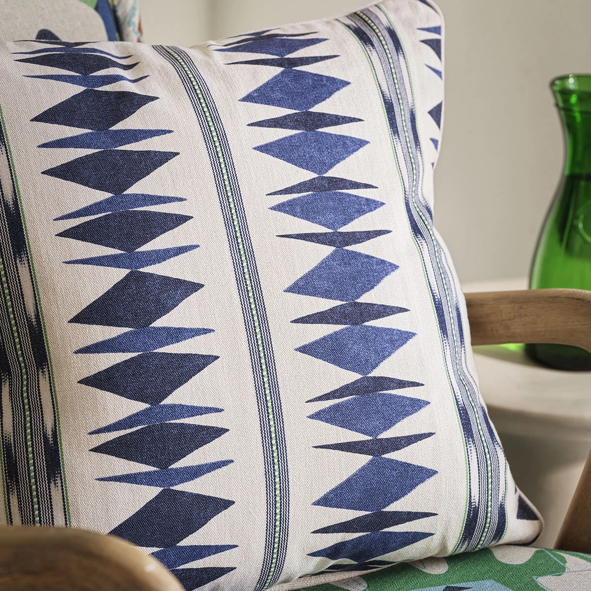 Asymmetrical diamonds are hand-printed on a jacquard woven ikat stripe fabric.