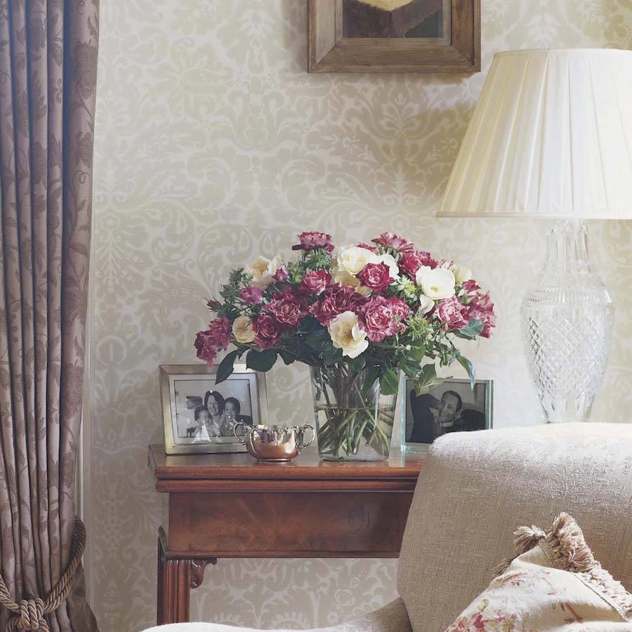 Our Silvergate wallpaper brings a luxurious feel to rooms of all sizes. Printed with real Farrow & Ball paint, the ornate flourishes of its heritage design are given a damask-like velvety effect.