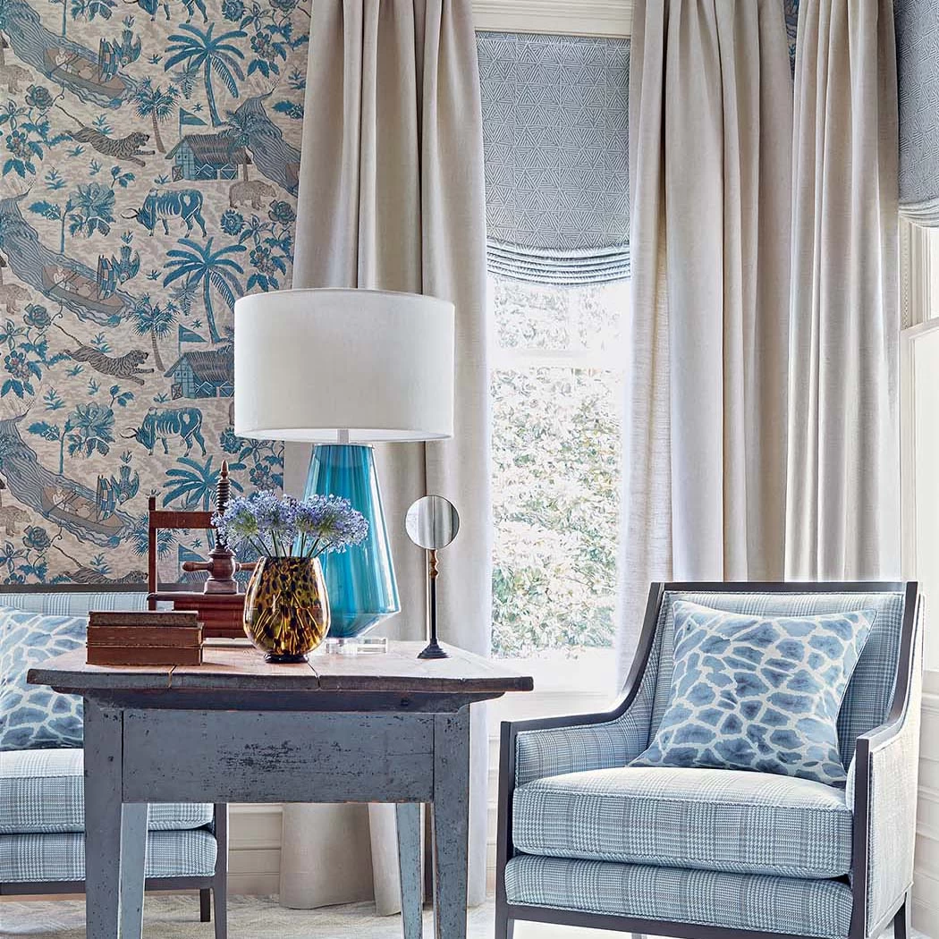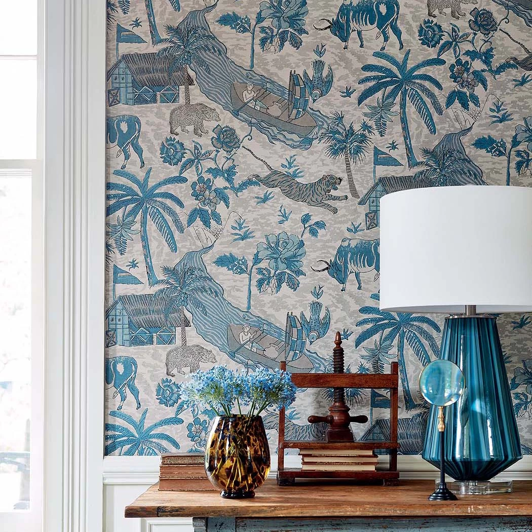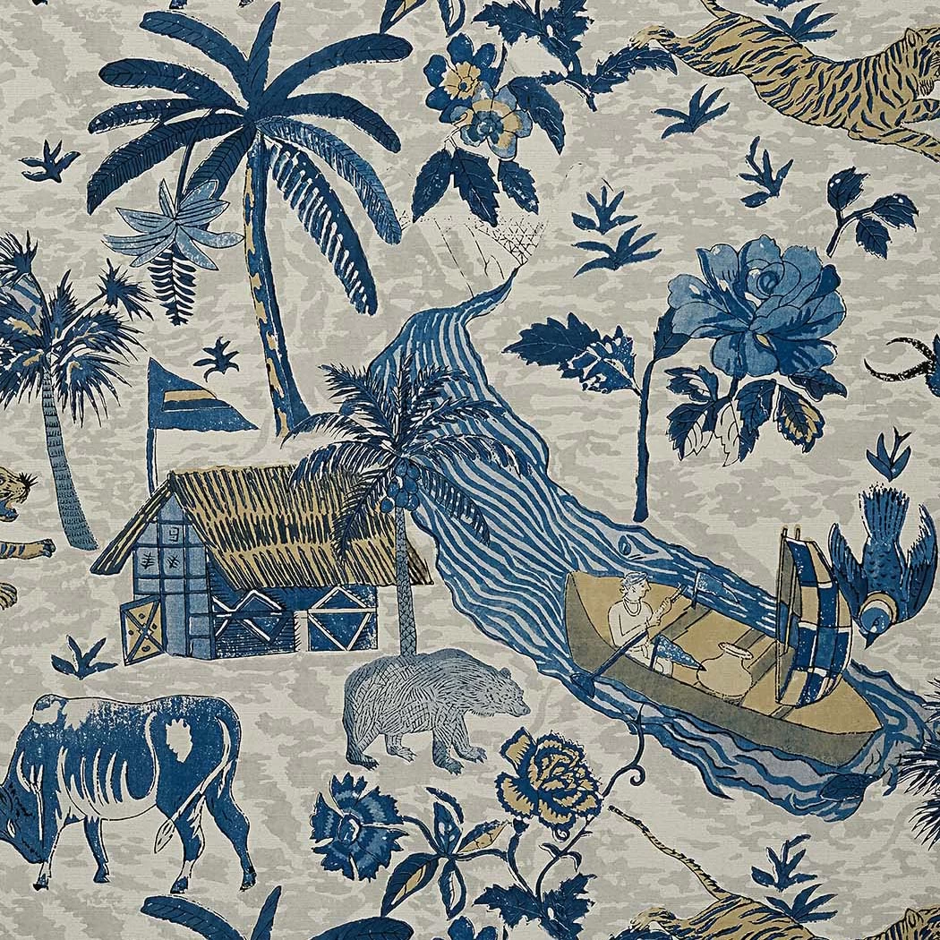 A large scenic featuring tigers, bulls, bears and birds roaming along a river scene. Other elements include owers and palm trees, huts and fishermen, all sketched and found throughout the large repeat.