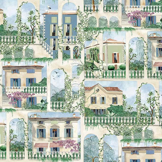 A repeating scene of traditional lakeside villas and stone colonnades adorned with foliage and climbing wisteria is set against a hillside backdrop, inspired by the beautiful lakes of Northern Italy.